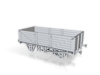 This model represents an 18ft, 5 plank open wagon with side doors as commonly used to transport coal and other minerals across Britain's rail network. While no attempt was made to model a specific wagon it is similar in style to the Railway Clearing House design of 1923 and is available with one of three brake arrangements (see here for a discussion of wagon brakes).